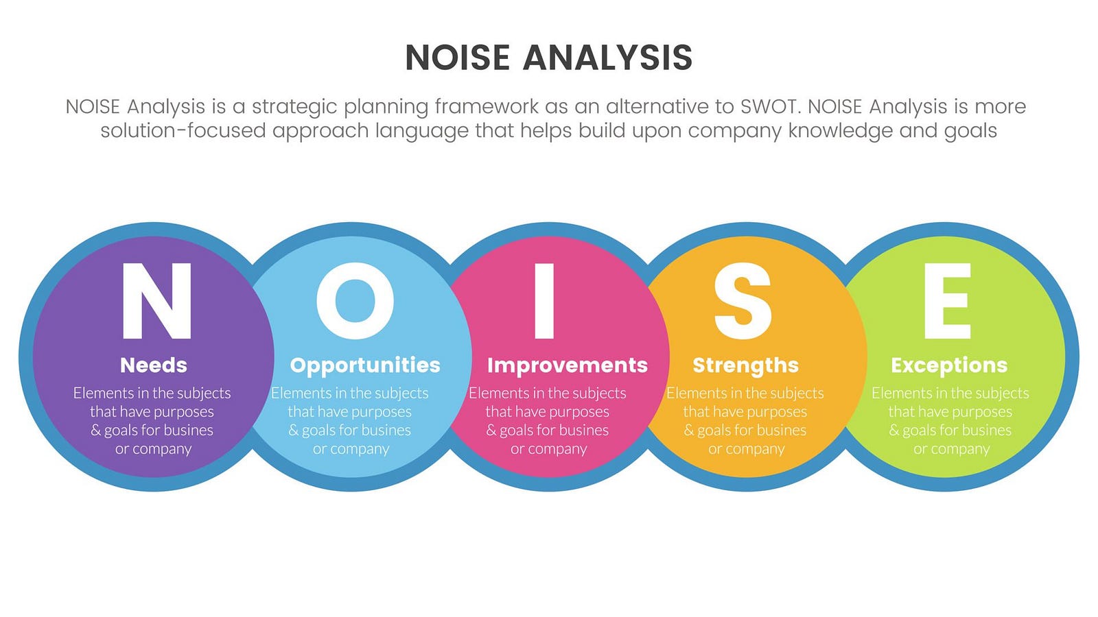 The NOISE analysis is similar to both SWOT and SCORE but it tends to be very analytical in nature. It starts with Needs, Opportunities, Improvements, Strengths, and Exceptions.